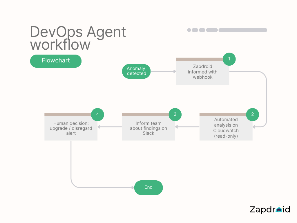 Using Zapdroid, clients are beginning to utilize agents-based systems in DevOps and cybersecurity already. By connecting an agent to CloudWatch logs and linking it to anomaly detection alarms that trigger an LLM, one of our bots can automatically identify what went wrong about 50% of the time. Given that 50% is not a lot, but it represents a significant step forward in automating complex troubleshooting processes. This capability frees up human experts to focus on the most challenging problems while allowing the system to handle more straightforward issues autonomously. As the technology evolves and the agent’s accuracy improves, this percentage is expected to rise, potentially transforming the efficiency of incident response and resolution in DevOps and cybersecurity.