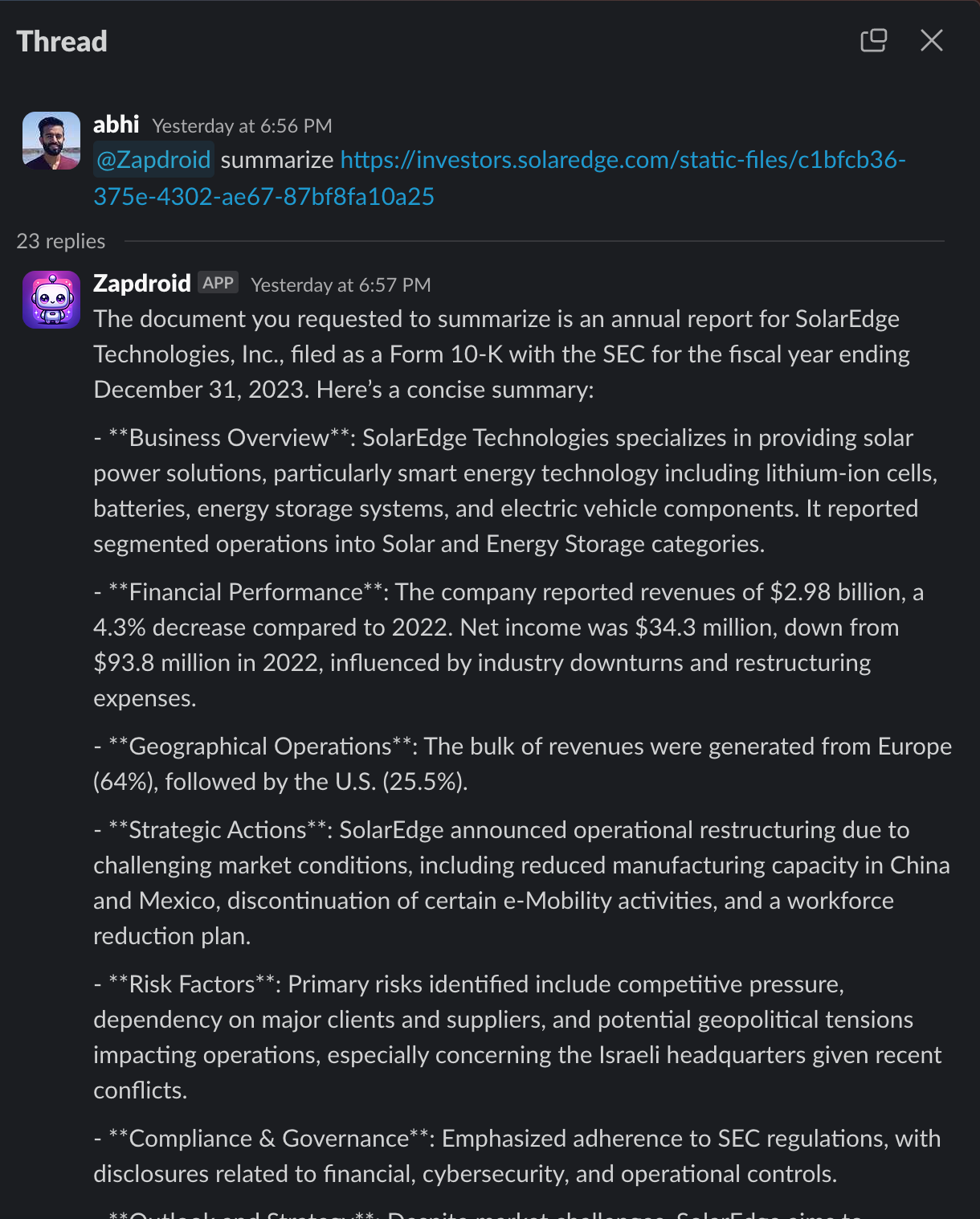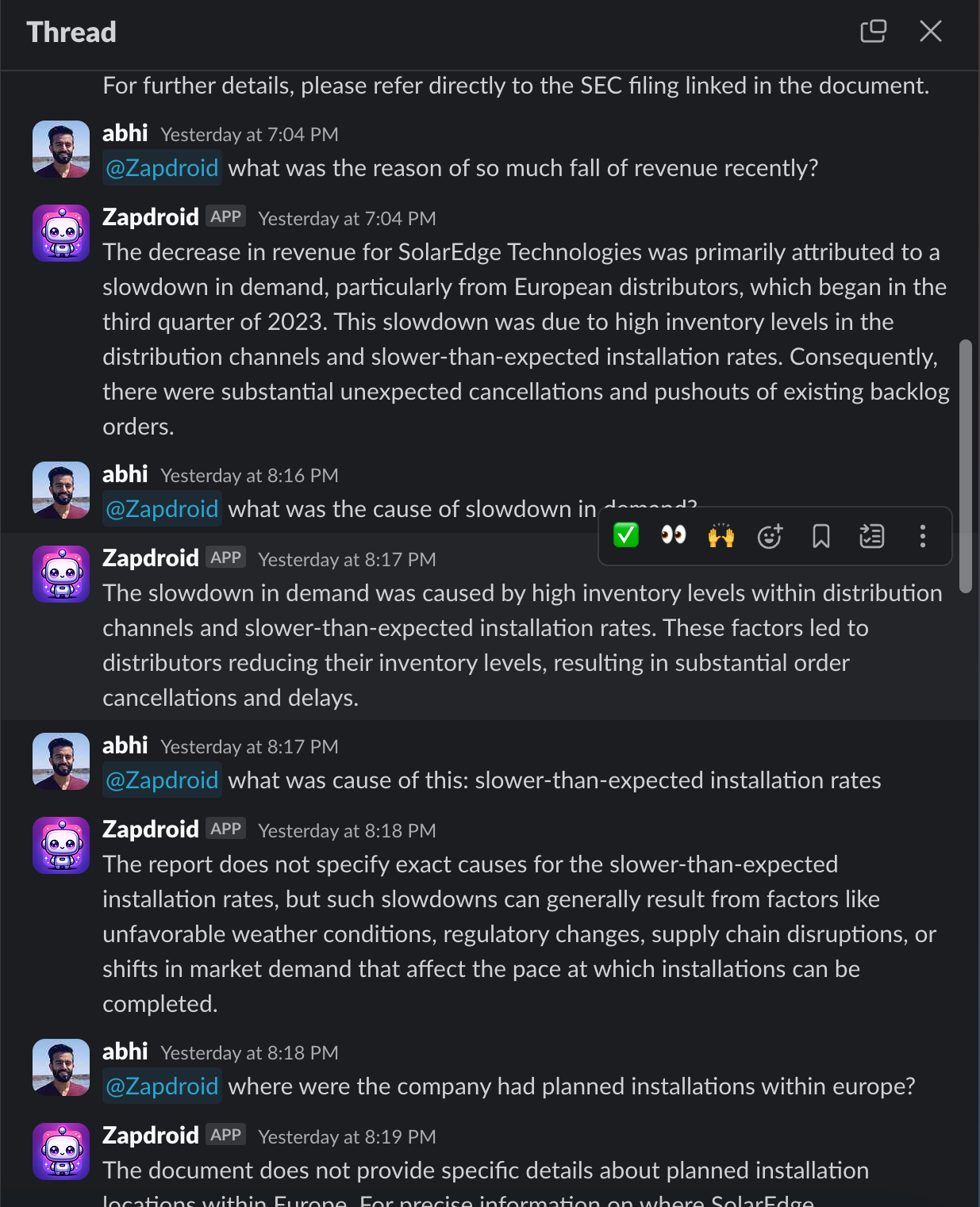 For instance, if you're reviewing a financial report or a 10-K SEC form, you can ask Zapdroid, "What were the main factors affecting revenue in Q2?" or "What are the company's risk factors?" The AI agent will parse the document and deliver precise answers, saving you valuable time and effort.